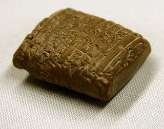 The library's oldest item is a Sumerian tablet, circa 2046-2037 BCE. Written in cuneiform script pressed into clay, this "messenger text" lists goods that might have been included in an ancient shipment, such as beer, bread, oil, spices, and onions.